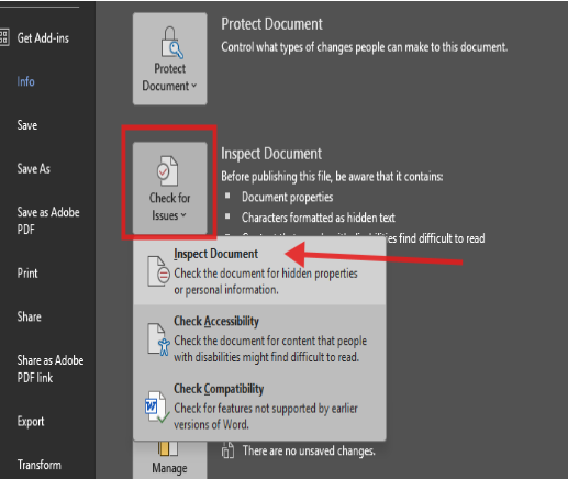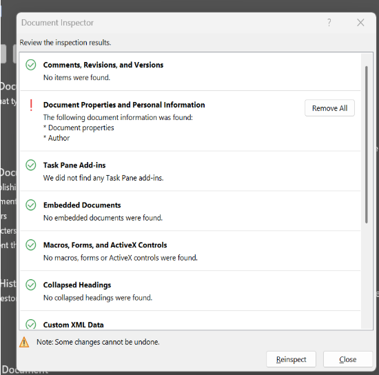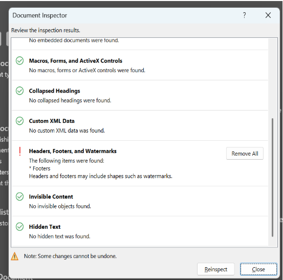 - The small Document Inspector window will pop-out, press 'Inspect' button: